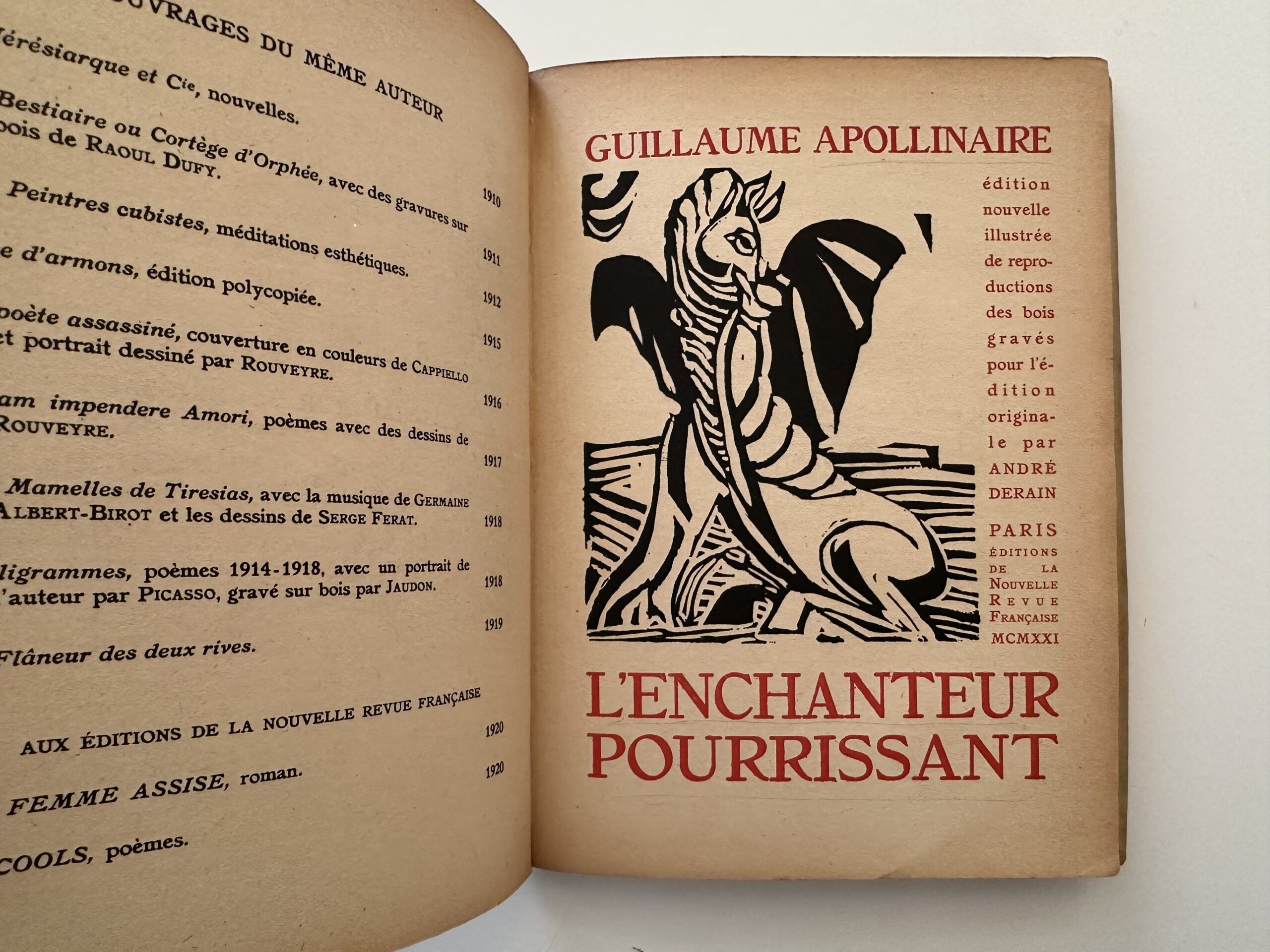 L’Enchanteur pourrissant (The Enchanter Decaying) is a work by Guillaume Apollinaire, written at the age of eighteen, published in 1909, and centered on the character of Merlin from Arthurian legend. A mixture of theater, poetry, and novel, it contains a large number of references to ancient mythologies, particularly Celtic, and to the Bible. – With the remarkable illustrations by Derain and in a special private binding.