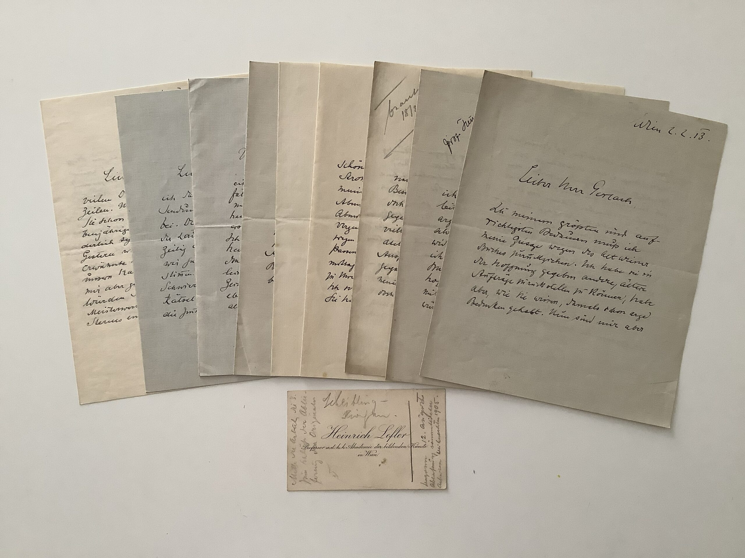 To Marting Gerlach sen. from Buch- und Kunstverlag Gerlach & Wiedling, because of lack of time it is impossible to contribute to the „Alt Wiener Buch“ (2.II. 1913), regarding an appointment (13.V.1913 with a mounted business card from Konrat Mautner), about his work at a costume-studio which went bankrupt and therefore he will work less for them (16.VIII, 1913), about the welcome interruption of his grass widower because of a visit by Gerlach (19.VIII, 1913), asking for a notice „wie viele Schwarz-weiss Zeichnungen für den Mozart vorgesehen sind“ (how many black and white drawings he needs for the Mozart, 2.IX, 1913), and with a reminder for this request (16.IX. 1913), asking to help him in financial matters by transferring him the fees for the „des Moerike-Honorars“ (9.VII, 1914), about sending drawings (14.VII, 1914>), and possible projects for books „(…) Mit dem Theresiabuch mögen Sie schon recht haben. Es ist der sieben jährige Krieg jetzt auch keine sonderlich sympathische Erinnerung. Gestern war Emil Wetzler (d.i. der Musikverleger E.W.) bei mir u. erwähnte Ihre Idee eines Buches über unseren Kaiser. Das ist gewiss gut, würde mir aber gar nicht liegen . Würden Sie nicht an einen Band Ihrer Meisterwerke d(eutscher) P(rosa) denken? Mein Plan von Sterns empfindsamer Reise ist ja jetzt hinfällig. Aber wäre nicht an Hoffmanns Frl. v. Scuderi zu denken od. wenn dies wegen des frz. Milieus unpassend wäre, vor Allem überhaupt an Reuters „Dörchläuchting? (…). (Letter from 30.VIII.1914). The business-card with notes about a work for the editorial „Ablieferung (…) Weihnachten 1905“.