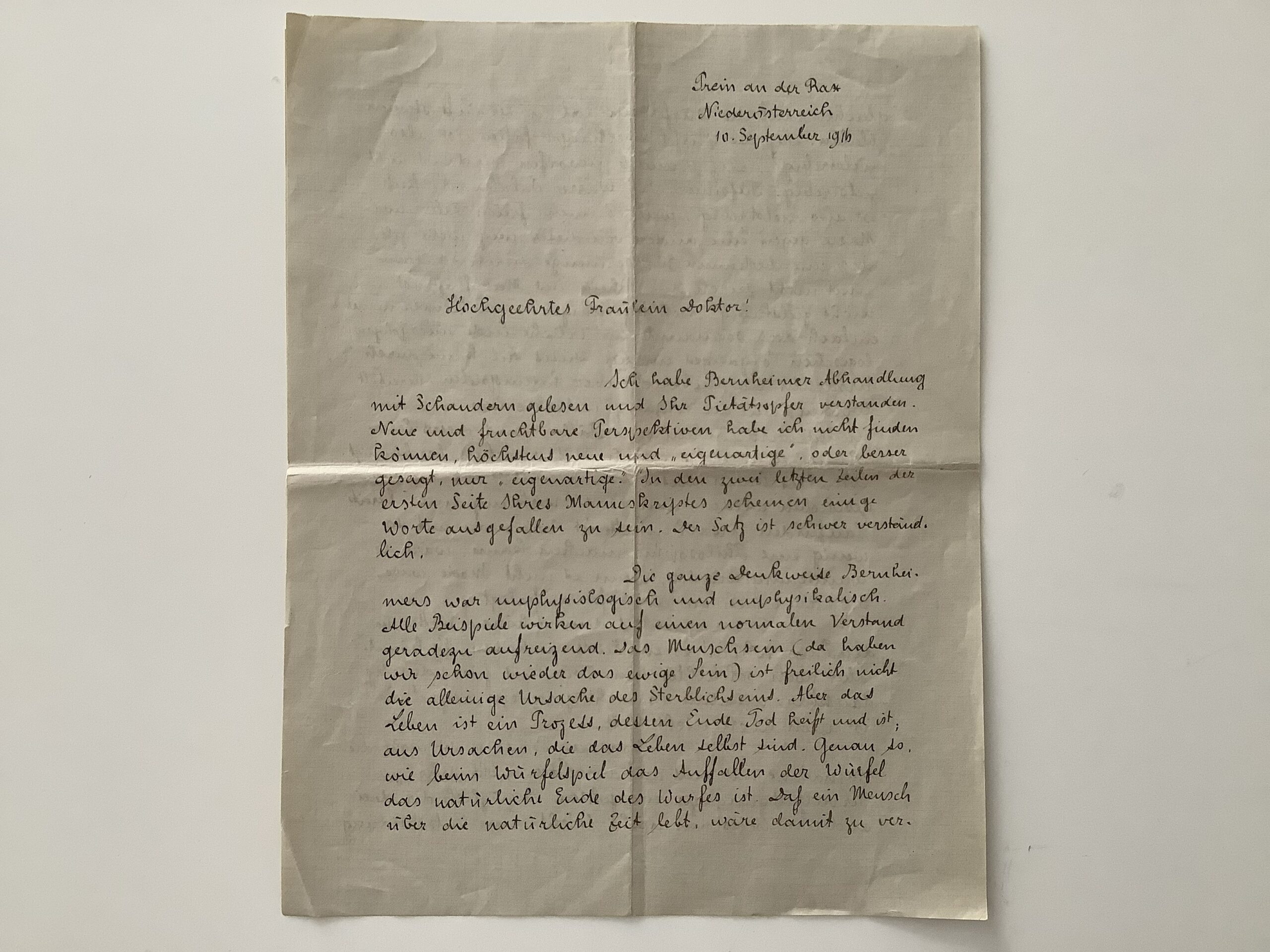 To an unknown young lady: „Ich habe (Ihre) Bernheimer Abhandlung mit Schaudern gelesen und Ihr Pietätsopfer verstanden. Neue und fruchtbare Perspektiven habe ich nicht finden können, höchstens neue und ‚eigenartige‘, oder besser gesagt, nur ‚eigenartige‘ (…)Die ganze Denkweise Bernheimers war unpsychologisch und unphysikalisch. Alle Beispiele wirken auf einem normalen Verstand geradezu aufreizend. Das Menschsein (da haben wir schon wieder das ewige Sein) ist freilich nicht die alleinige Ursache des Sterblichseins. Aber das Leben ist ein Prozess, dessen Ende Tod heißt und ist; aus Ursachen, die das Leben selbst sind. Genau so, wie beim Würfelspiel das Auftreffen der Würfel das natürliche Ende des Wurfes sind (…)“.