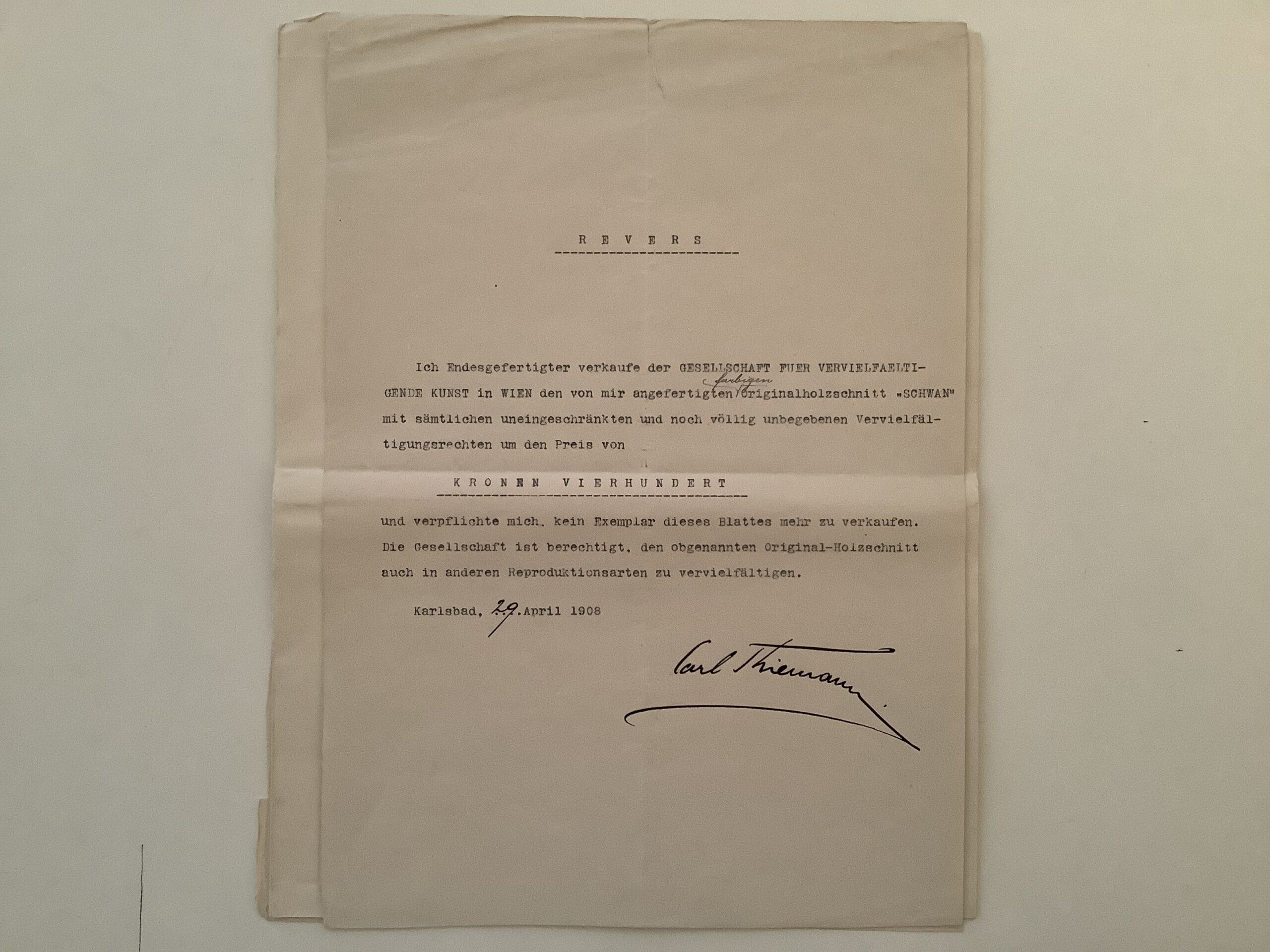 Contracts about the sale of his original woodcut “Schwan” (29.IV. 1908), “Birken im Herbst” (26.VIII. 1908), “Abend vor Venedig” (28.IV.1911) and “Bach im Winter” (31.VII.1915) including right of reproduction to the Gesellschaft für vervielfältigende Kunst in Vienna. – Supplement a typewritten letter by the laywer Wilhelm Diess, who was representing Thiemann legaly, in a lawsuit about the woodcut “Abend in Venedig” (dated Munich, 2.XII.1920). – Was folded in the middle.