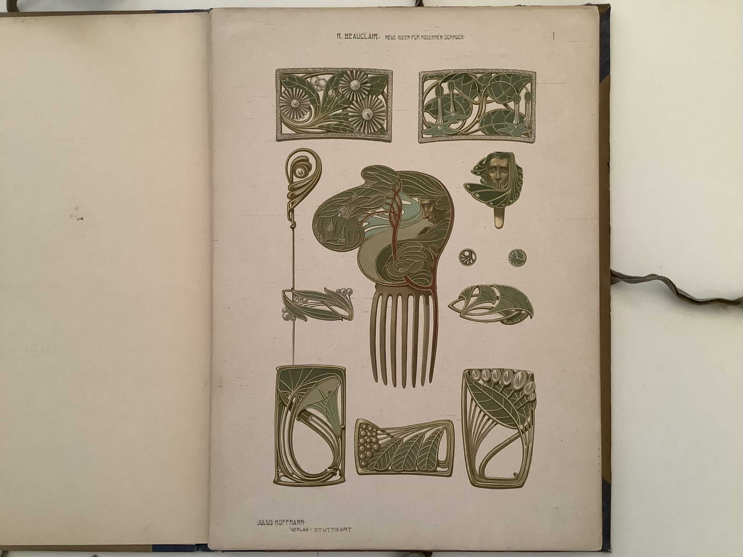 René Beauclair’s “New Ideas for Modern Jewelry” is a historical work from 1900 that contains 24 plates with sketches and designs. The ideas are not current, but represent the Art Nouveau spirit of the time and offer insight into historical jewelry trends that can serve as inspiration. The volume was published in collaboration with other artists and is a valuable resource for historical jewelry research. With beatutiful art nouveau designes for jewllery. – Missing plates 19 und 22.