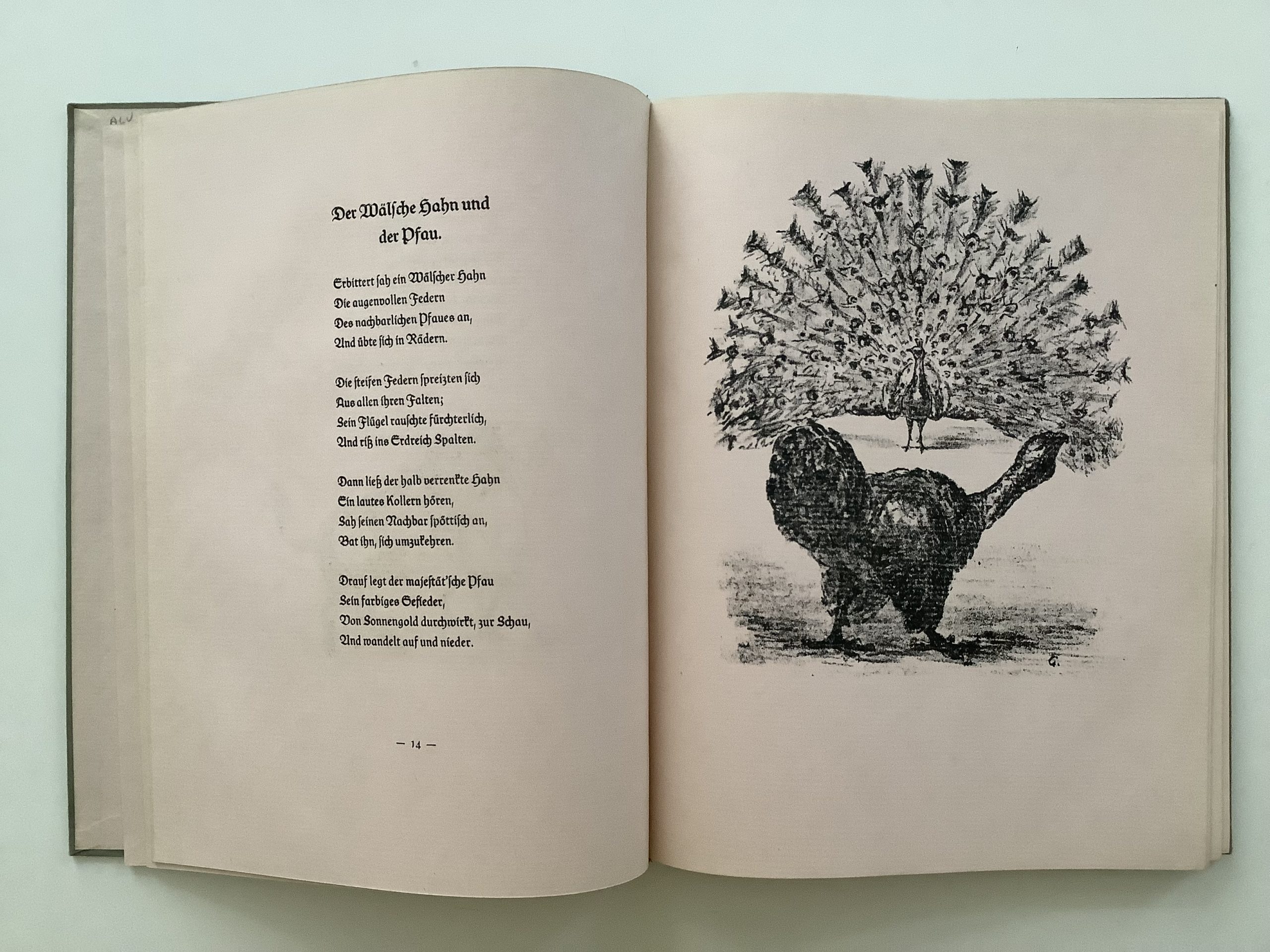 Erste Ausgabe. Auf rosa Papier gedruckt. Mit Texten aus Ramlers Fabellese von 1783. „75 Original-Lithographien, davon 14 ganzseitige, auf der lithographischen Schnellpresse von W.M. Lassally abgezogen. Der lichte Satz aus der Fraktur von E.R. Weiß – für dieses Werk wie geschaffen, da sich die alten Texte und die neuen Illustrationen darin symbiotisch vereinen – die Leichtigkeit der zahlreichen Bilder und nicht zuletzt die humorvollen Fabeln machen dieses Werk zu einem Glanzpunkt der Fabelillustration Anfang dieses Jahrhunderts, dem auch Ulrike Erber-Bader ‚eine vorbildlich schöne Gesamtgestaltung‘ bescheinigt. (Illustration 63, Heft 1/1981, S. 26-27). – XIV. Werk der Panpresse. – Einband etwas fleckig, innen sehr schönes Exemplar. – Feilchenfeldt/Brandis 158.1.