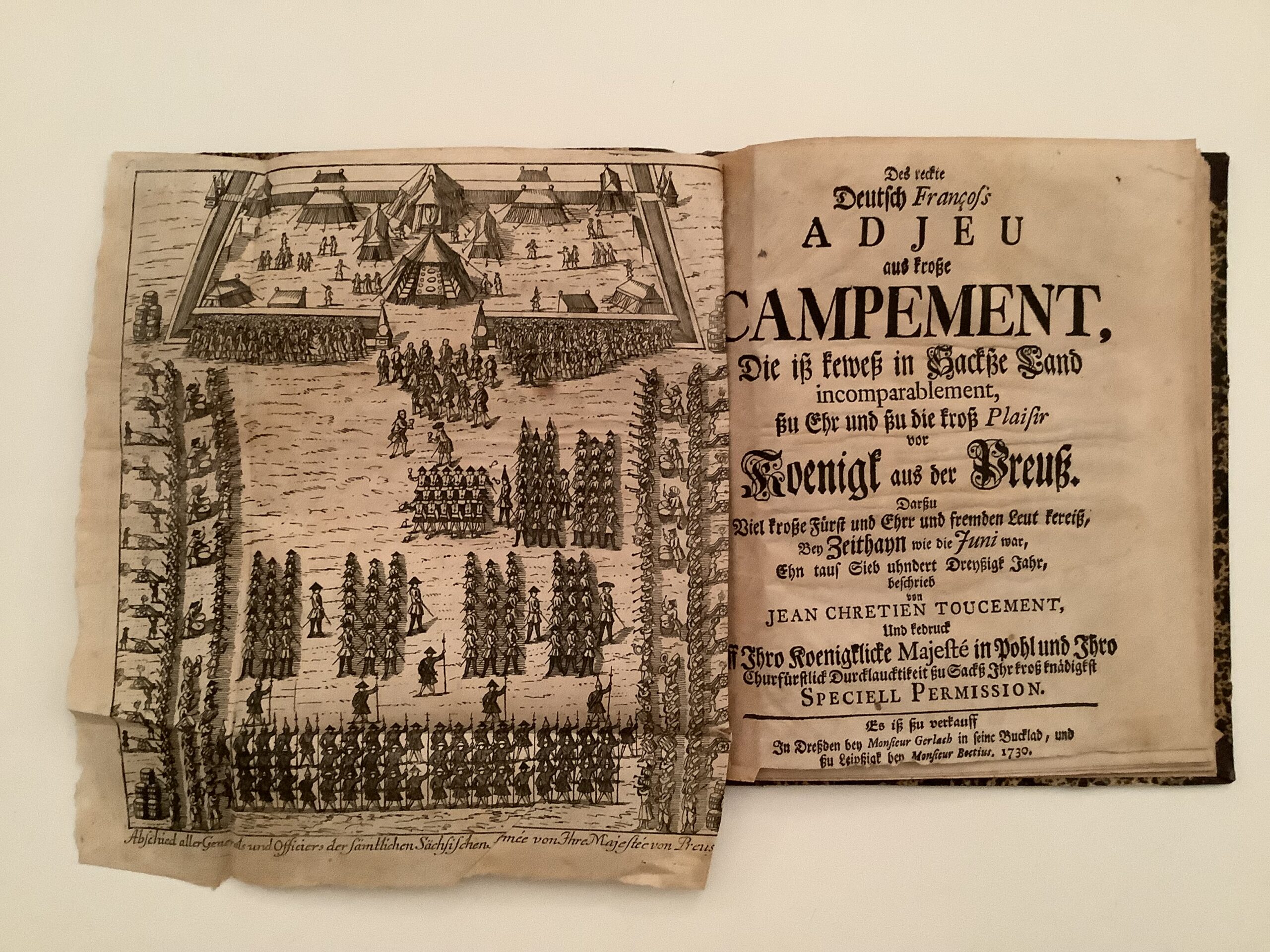 1730 beobachtete und besang T. das große Feldlager oder ‘Campament’ bei Mühlberg…Die Beschreibung (desselben) ist immerhin, da sie unter die gemeinen Soldaten, ja zu Wald- und Feld- ‘Banisen’ herabstieg, viel lebendiger als König’s unsagbar steifleinenes Heldgedicht ‘August im Lager’ (ADB). Das Frontispiz zeigt das feierliche Zeltlager. Die vorliegende Beschreibung wurde 1736 in “des Deutsch Francos Schriften” aufgenommen. Aus einem Textvergleich mit dem Gesamtwerk ist zu ersehen, daß die Seiten 7/8 ausgelassen wurden und der Text vollständig ist. – Goed. IV/1, 39, 5; ADB XXXVIII, 636 ff.; nicht bei F.d.F., Hayn-Got. etc.