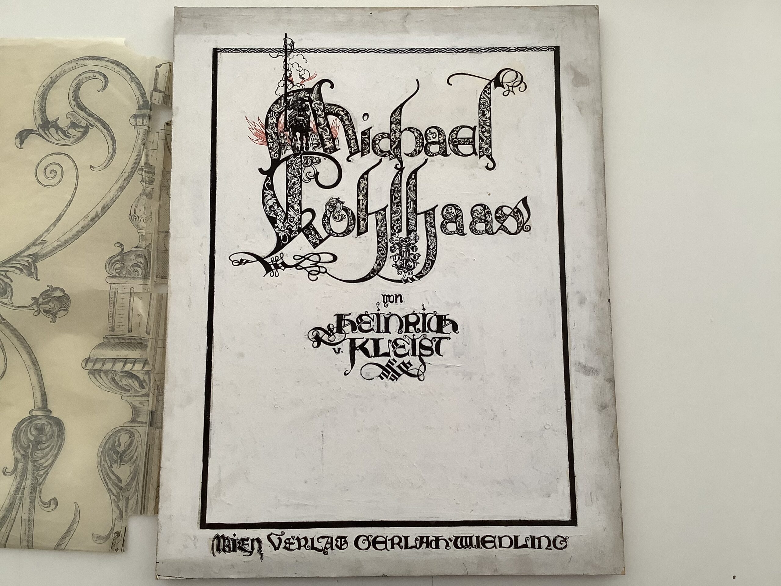 Titelentwurf zu Heinrich von Kleists Michael Kohlhaas in ornamentaler Schrift, im Buchstaben M der ‘Junker von Tronka’ die Titelfigur von Kleists Roman. – Roland Strasser (* 26. April 1892 in Wien, Österreich-Ungarn; † 1974 in Santa Monica, Kalifornien) war ein österreichischer Maler und Grafiker. Strasser war der Sohn des Bildhauers und Malers Arthur Strasser, er studierte zunächst an der Wiener Akademie bei Jungwirth; in den Jahren von 1911 bis 1915 an der Münchner Akademie, sein Lehrer dort war Angelo Jank. Über sein Frühwerk ist wenig bekannt. Wie sein älterer Bruder Benjamin Strasser, der ebenfalls Malerei und Grafik erlernte, konnte er während des Ersten Weltkriegs einen Posten als Kriegsmaler in der Kunstgruppe des k.u.k. Kriegspressequartiers ergattern. Später illusstrierte er Jugendbücher. – Detailliert ausgeführte Aquarelle, im Zentrum steht die Zentralfigur von Kleists Roman den ‘Junker von Tronka’, den Schlossherrn auf der Tronkenburg in Sachsen.