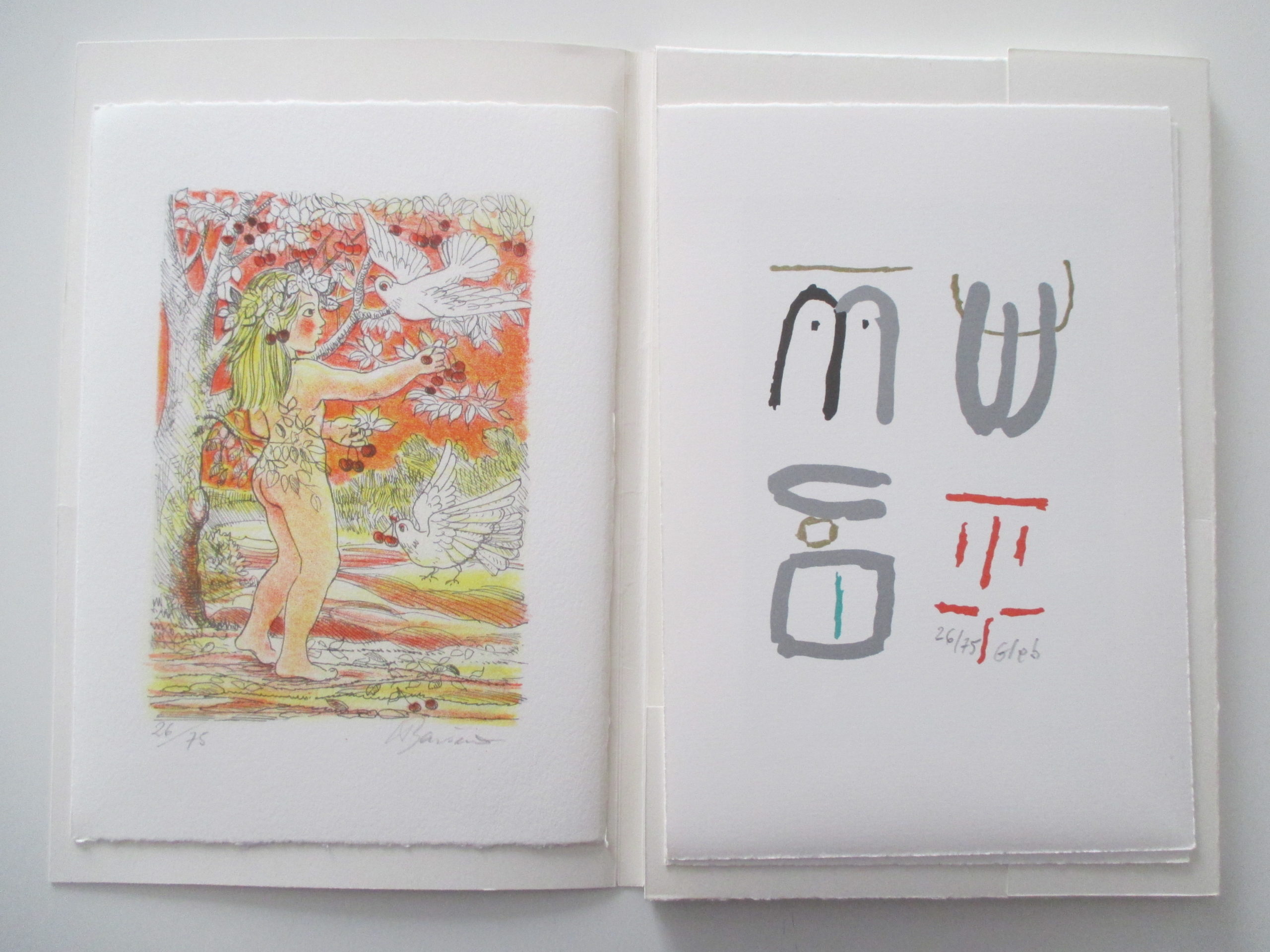 24 : 16 cm. 265 Seiten, 3 Blatt mit 12 (11 signierten und numerierten) farbigen Original-Lithographien. Farbig illustrierter Original-Karton in OPp.-Schuber.