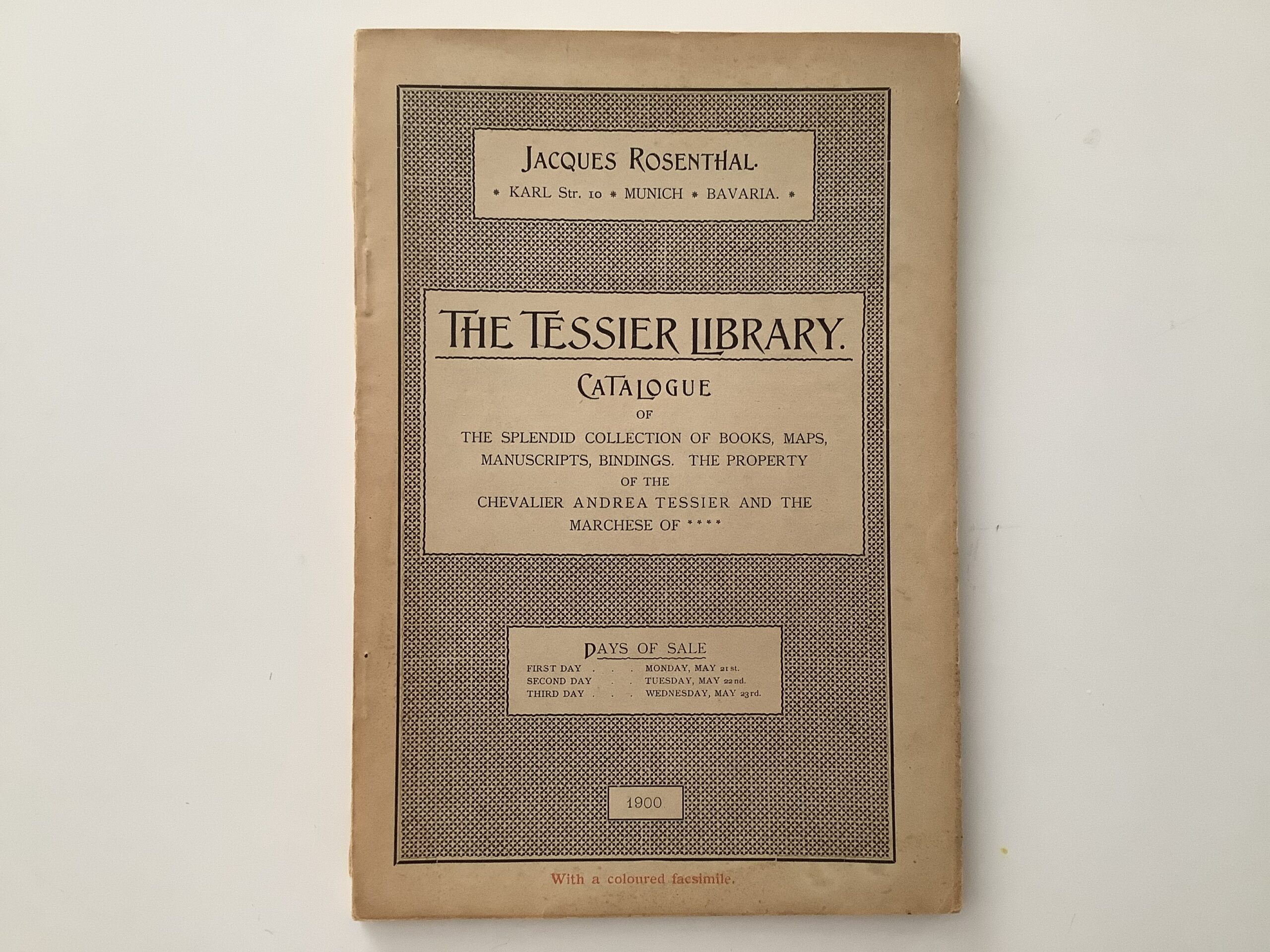 Very rare auction catalogue of parts of the famous Library of Andrea Tessier. Describes 992 items. – The coloured plated glued.